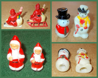 Supercook are still around, or were until quite recently; stores still have 'new' stock, and were carrying resin dinosaurs! To wit: a T-Rex and a rather dodgy-looking Triceratops along with a shallow-spiked 'Happy Birthday' label. They've got cartoon faces, which could be painted out, but as they're going to stay in the packaging, they can stay looking a bit dim-witted! Keeping them sealed will also - hopefully - keep them from the inevitable chips or broken extremities which resin figurines tend to suffer from. Back to the contents of the tub, and the Santa Clause - holding ball and teddy bear - was a new sculpt (to me), and joins these others who/which have come-in over the last year or so, all Gem/Festival and all seen before. Note the yellow one has lost it's skis, for which it has the lugs, but which weren't heat-sealed underneath the ski, hence the loss! Another thing I've discovered over the last couple of years is that George Musgrave experimented with different icing spikes or "picks" to hold the things onto the cakes before adopting the common flat base you just squidge into the icing before it sets! A few other points of note, clockwise from top left; A variation of the Hong Kong copy of Gem's sledging Santa' is equipped with a stick-on sheet of 'snow' (left of pair), two snowmen who are primarily pencil-tops, but could also be used as cake decorations and a size variation of the smaller Hong Kong Father Christmas we've seen here before.That's it, I'll try to do more cake decorations, this time next year, and we'll be back to more normal output from now. That is, with silent-gaps, while I get this house sold and move into a temporary (I hope!) rented flat I paid-for, in advance, in full, several weeks ago!
